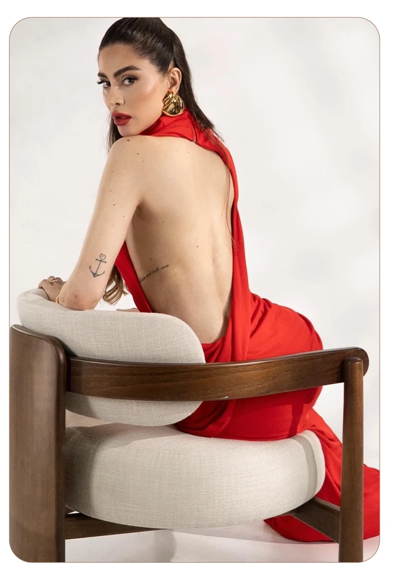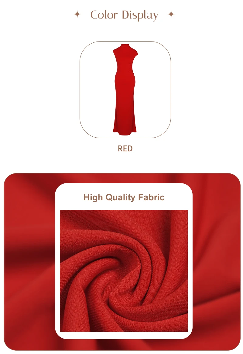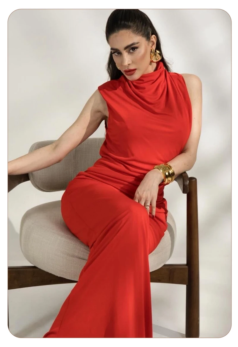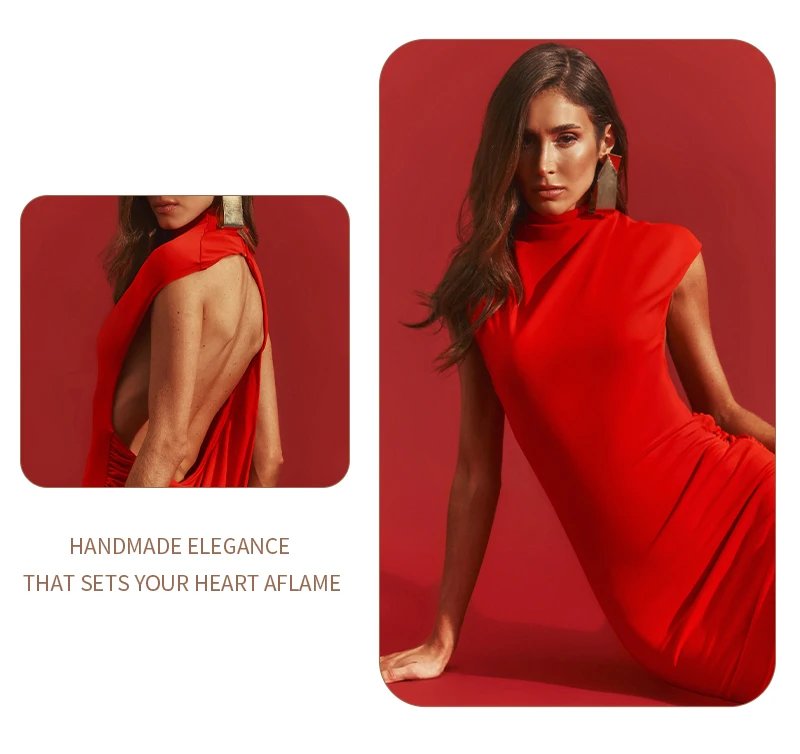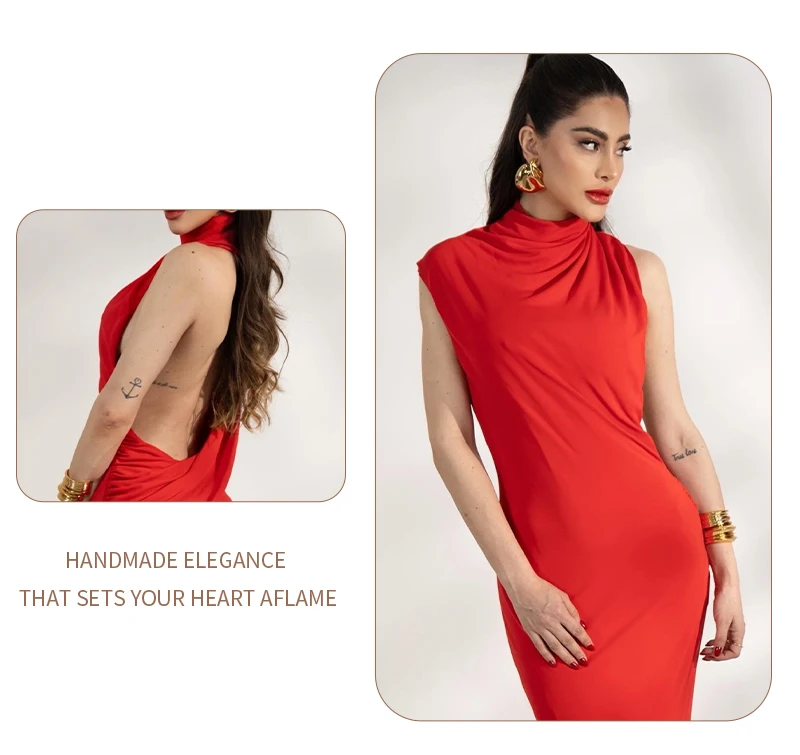 Mathilde Red High Neck Sleeveless Maxi Dress is an elegant open back maxi dress designed for formal sophistication. This red evening gown features a chic high neck and a dramatic backless drape, creating a stunning mermaid silhouette. Crafted from premium stretch jersey, the Mathilde offers a body-hugging fit that ensures all-day comfort for galas, weddings, or black-tie events. Elevate your wardrobe with this timeless formal red dress that balances modesty with a bold, sculptural edge.